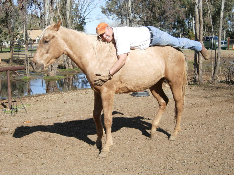 Rick and Buddy at two, Buddy learning to accept me on his back